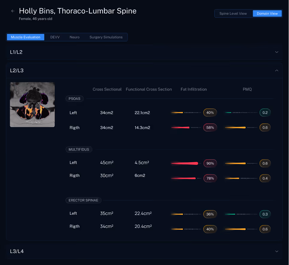 QIBs do not replace surgical judgment. They make surgical judgment more specific. They help surgeons move beyond broad labels and see the actual biology of the operative level. Muscle quality can support tissue preserving approaches. Disc and endplate biomarkers can sharpen the choice between decompression alone and stabilization. Bone quality can inform implant strategy. Neuro and facet metrics can highlight when compression is part of a larger instability problem. That is the real value of the Tissue Typing module. It turns the preoperativeMRI into a more useful map for choosing the right technique, the right modality, and the right approach for the patient in front of you.