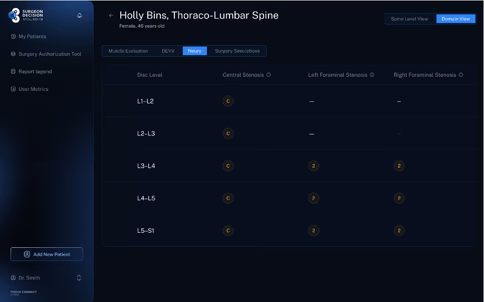 Most spine surgery planning still begins with a familiar routine. A surgeon reviews the MRI, matches the imaging to the patient’s symptoms, and decides what surgery the patient may need. That process works, but it often leaves important information on the table. A standard read may describe stenosis, disc degeneration, and alignment, yet it may not fully describe the tissue environment that will support, or undermine, the operation. The Tissue Typing module in the SurgeonDecision Intelligence Platform is built to close that gap. It extracts level by level quantitative imaging biomarkers, or QIBs, from each spine MRI. Those biomarkers include muscle metrics such as functional cross sectional area, fat infiltration percentage, fibrous intrusion, and paraspinal muscle quality score. They also include disc and endplate metrics such as the DSI squared score and Modic related change, bone quality metrics such as VBQ and MRI derived QCT, and neuro and facet findings such as central stenosis, foraminal stenosis, and facet joint effusion size.