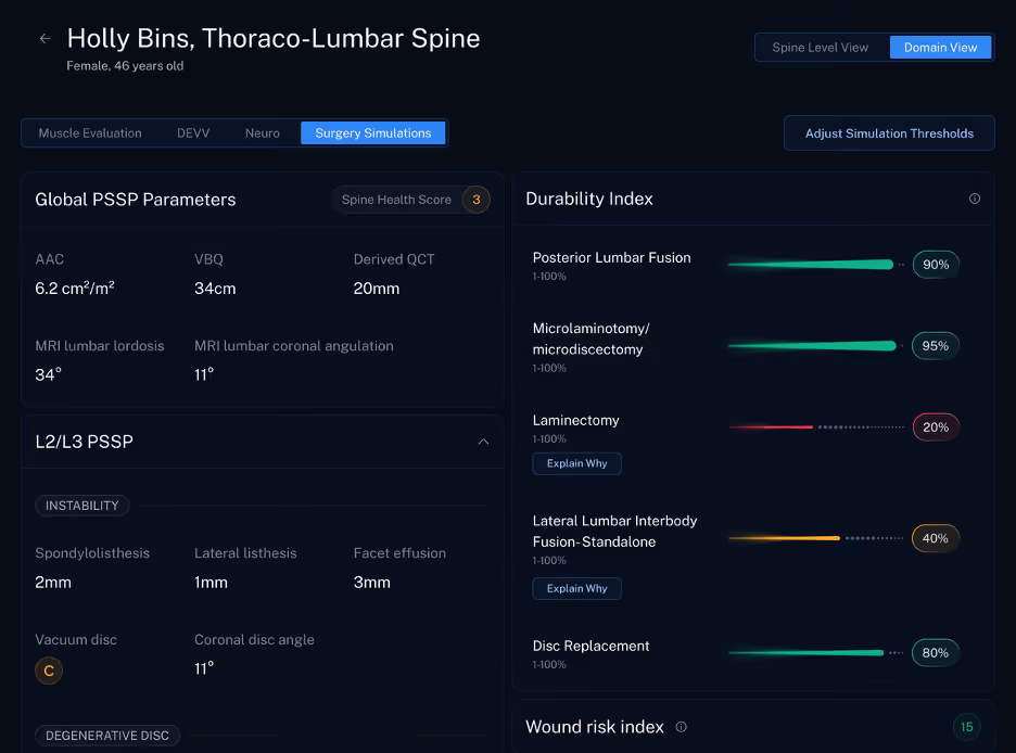 In the surgical simulation module, we predict and compare 2 year outcomes across surgical approaches before the case happens. That includes broad procedure categories that spine surgeons already consider every day, including arthroplasty, decompression, posterior fusion, lateral fusion, and anterior fusion. The point is not to replace judgment. The point is to strengthen it.
