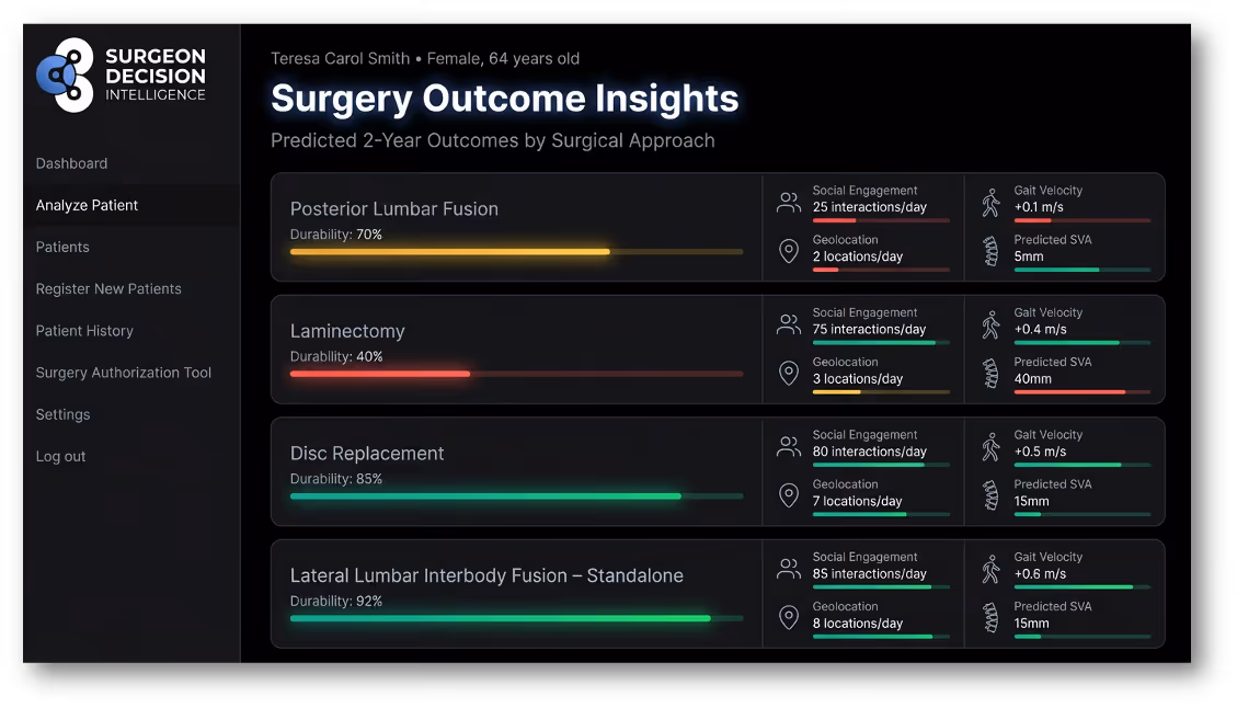 That is the vision behind Surgeon Decision Intelligence. Start with 2 year durability because it is one of the clearest windows into whether a procedure truly succeeded. Then build toward a model that predicts function with enough precision to make spine care more personal, more rigorous, and more useful to the people we treat.