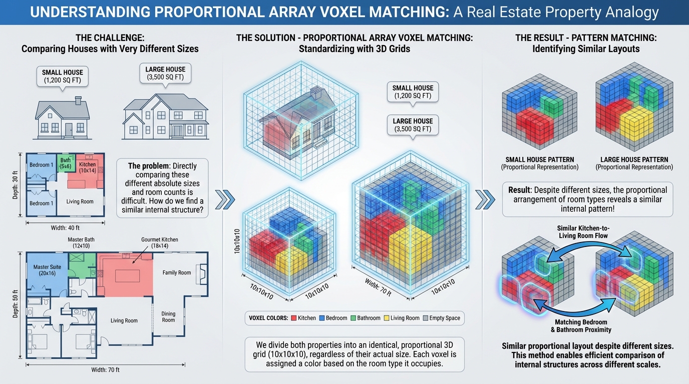 Here's where Proportional Array Voxel Matching helps. You divide every apartment—regardless of size—into the same standardized 10×10×10 grid of cubes (voxels). Now a tiny studio and a spacious three-bedroom both fit into exactly 1,000 voxels. The difference is that each voxel in the studio represents a smaller actual space than each voxel in the larger apartment.