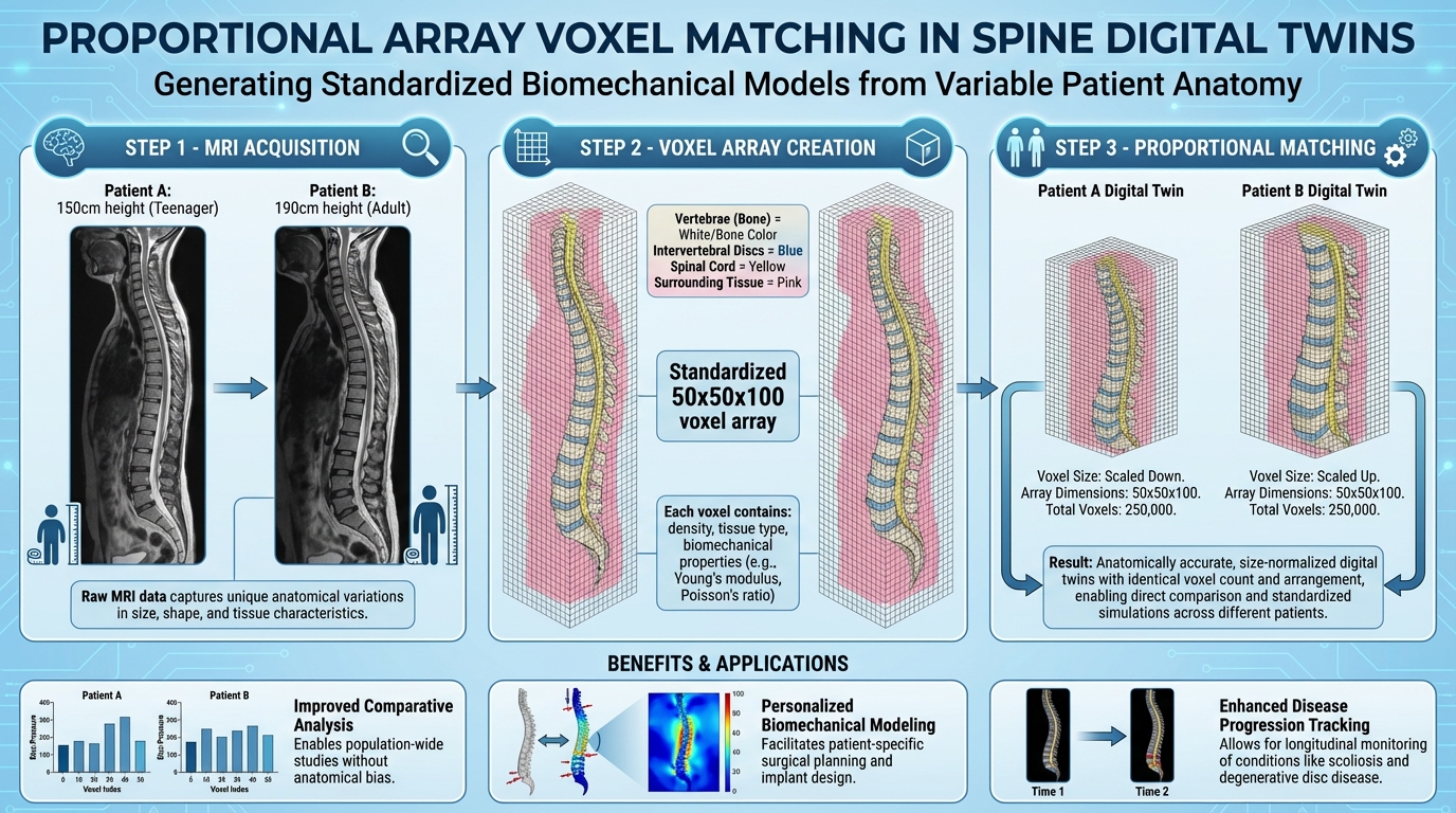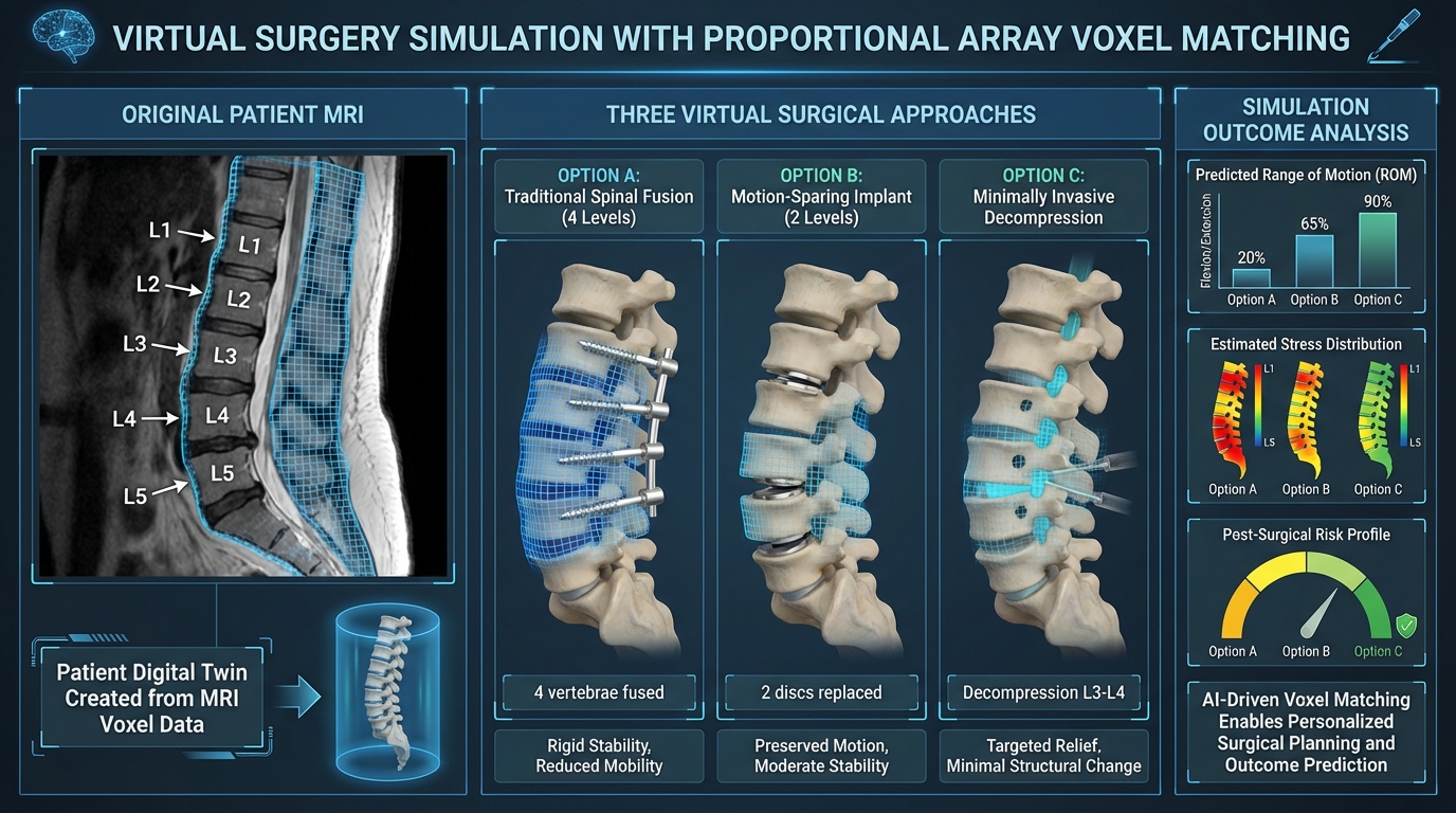 Proportional Array Voxel Matching offers an alternative. Doctors can create a predictive twin—a computer model of a specific patient's spine based on their MRI voxel data. Then they can virtually simulate different surgical approaches on this same digital spine. The system predicts outcomes for each approach by matching the post-surgery virtual spine against historical data.